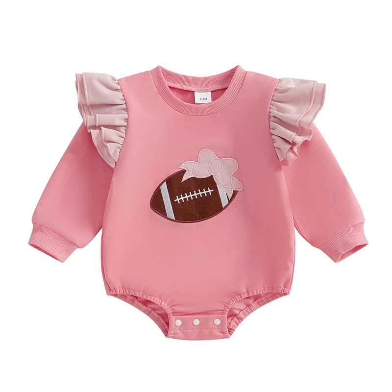 Dress your little one in sporty cuteness with this adorable football-themed bubble romper! Featuring a charming bow and football embroidery, this romper combines playful style with comfort. The long sleeves, round neck, and bubble-style fit make it perfect for active infants while keeping them cozy.