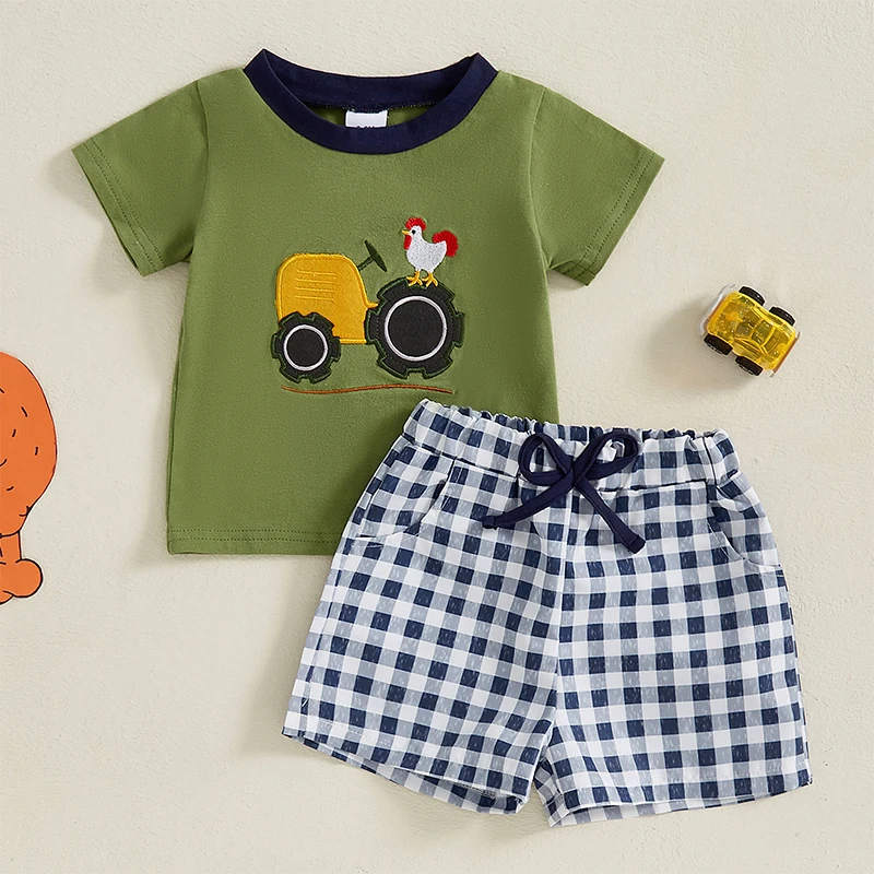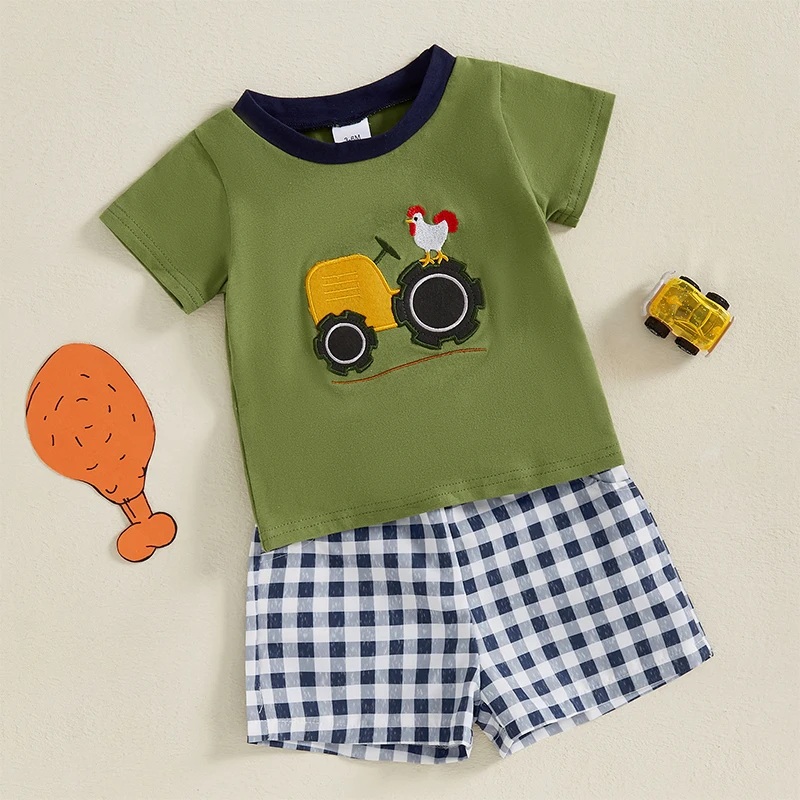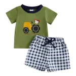 Gear up your little farmer with this adorable 2-piece outfit featuring a tractor print T-shirt and plaid shorts. Comfortable and playful, it’s perfect for everyday adventures and sunny days filled with fun and exploration.